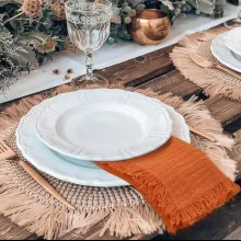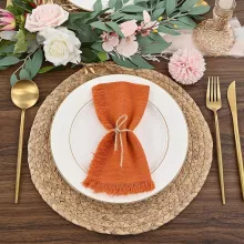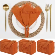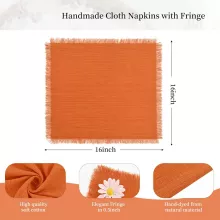 Add warmth and charm to your dining table with these 12PCS Orange Cotton Linen Cloth Napkins. Handmade with care from 100% cotton, each napkin features hand-pulled fringes that give a soft, rustic, and elegant touch. Measuring 16.5 x 16.5 inches, they are the perfect size for weddings, dinner parties, holiday gatherings, or even everyday meals at home.