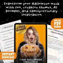 The 7-Day Halloween Challenge is your ultimate guide to celebrating Halloween with fun, creativity, and ease. This downloadable eBook is packed with step-by-step inspiration, AI-powered prompts, and daily themes that make planning your Halloween activities simple and exciting. Whether you’re a busy parent, a Halloween enthusiast, or just looking to add some seasonal fun to your week, this challenge will help you create unforgettable memories—without the stress of overplanning.