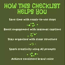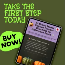 Don’t waste time staring at a blank screen. Download the AI Social Media Caption Creator Checklist for Halloween Posts now and start crafting captions that engage, entertain, and convert—all while saving hours of work. Make this Halloween your most successful social media campaign yet!