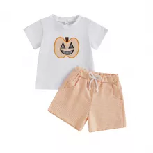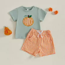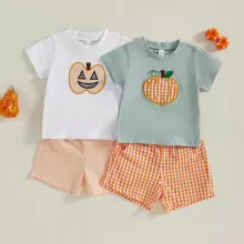 Dress your baby boy in the perfect blend of festive fun and everyday comfort with this 2-piece Halloween outfit set. Featuring a soft short-sleeve T-shirt with a playful pumpkin print and matching elastic plaid shorts, this set is made for making memories. Whether it’s for a Halloween party, a family photo, or just a day of fun, your little pumpkin will look absolutely adorable.