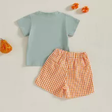 This outfit is thoughtfully designed for both comfort and style. The T-shirt is made from a breathable cotton blend with a round neckline and short sleeves, keeping your child cool during warm fall days. The plaid shorts come with an elastic waistband, ensuring a snug yet gentle fit for active little ones. With its festive pumpkin print and classic plaid design, this set makes dressing up both simple and stylish.