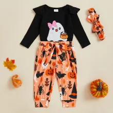 Make your baby girl the star of spooky season with this charming Halloween outfit set. Designed with a playful ghost print, this 3-piece ensemble includes a cozy long sleeve romper, matching pants with a fixed belt, and a sweet bow headband. Whether for a family photo, trick-or-treat night, or a festive fall party, this outfit is the perfect blend of comfort and cuteness.