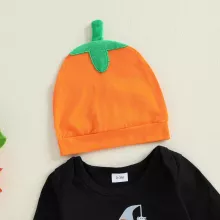 Made with a blend of cotton and polyester, the romper feels soft and breathable against delicate skin, while the pants offer a lightweight yet durable fit for crawling and playtime. The festive pumpkin design makes this set perfect for capturing memorable fall photos and celebrating baby’s first Halloween in style.