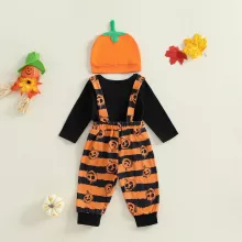 Get your baby ready for spooky season with this charming 3-piece Halloween outfit set. Designed with comfort and festive style in mind, this set includes a soft long-sleeve romper with a playful letter print, pumpkin-print suspender pants, and a matching hat. Whether it’s for a Halloween party, photoshoot, or cozy autumn day, this outfit will make your little one the cutest pumpkin in the patch.