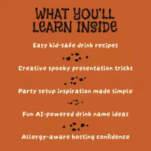 - Chapter 3: Party-Ready Drink Stations – How to set up a spooky drink bar, fun labels for kids, and important safety tips with allergy awareness.
