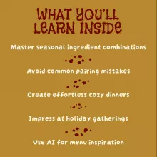 Unlike other pairing guides, the Fall Flavors Food Pairing Guide blends expert culinary advice with easy-to-use AI tools. From practical case studies to prompt examples for ChatGPT and Midjourney, you’ll have everything you need to create inspired dishes that impress your guests and delight your family.