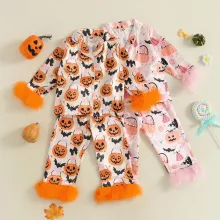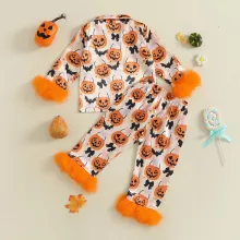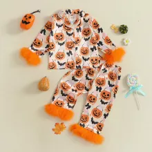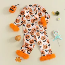 Make bedtime extra fun and festive with this adorable Halloween Pajamas Set for girls ages 1–9. Featuring a playful pumpkin print and soft feather cuffs, this two-piece loungewear set combines comfort with holiday charm. The button-up shirt with a lapel collar and long sleeves pairs perfectly with elastic-waist pants, giving your little one a relaxed yet stylish look for Halloween nights and beyond.