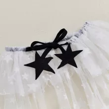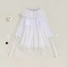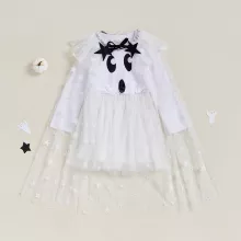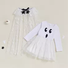 This charming outfit is designed to offer comfort and style in equal measure. The star-print mesh dress has a sweet, whimsical feel, making it perfect for fall festivities and beyond. The long sleeves provide warmth for cooler weather, while the flowing cape adds a magical touch that your child will adore. The round neck and A-line shape make this dress easy to wear, while the cape gives it a graceful finish that’s both fun and fashionable.