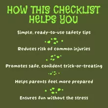 - Secure walkways at home by clearing obstacles and adding lighting for visiting trick-or-treaters