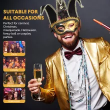 Step into the spotlight and make a lasting impression with our Jester Venetian Style Mask! This beautifully crafted half-face mask is the perfect accessory for any masquerade ball, Halloween party, or carnival celebration. Designed for both men and women, its striking appearance combines traditional Venetian elegance with a playful twist. Whether you’re attending a grand masquerade or just looking for a fun addition to your fancy dress, this mask is sure to turn heads!