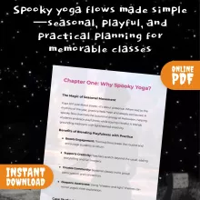 • Chapter One: Why Spooky Yoga? — The magic of seasonal movement, benefits of blending play with practice, and a real case study of a Halloween-themed class that worked.