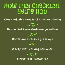 Parents, caregivers, teachers, and community leaders who want to encourage safe, polite, and thoughtful Halloween traditions will find this checklist invaluable. Whether you’re new to the neighborhood or a seasoned Halloween host, this resource makes the night smoother and more enjoyable for all.
