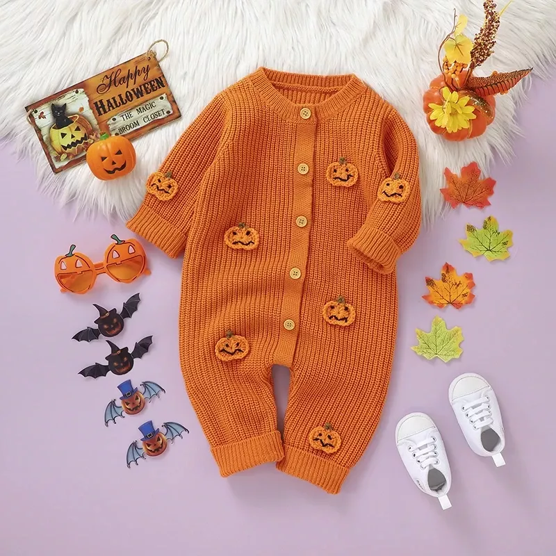 Halloween Baby Romper – Cute Pumpkin Knit Jumpsuit for Newborns 0-18M