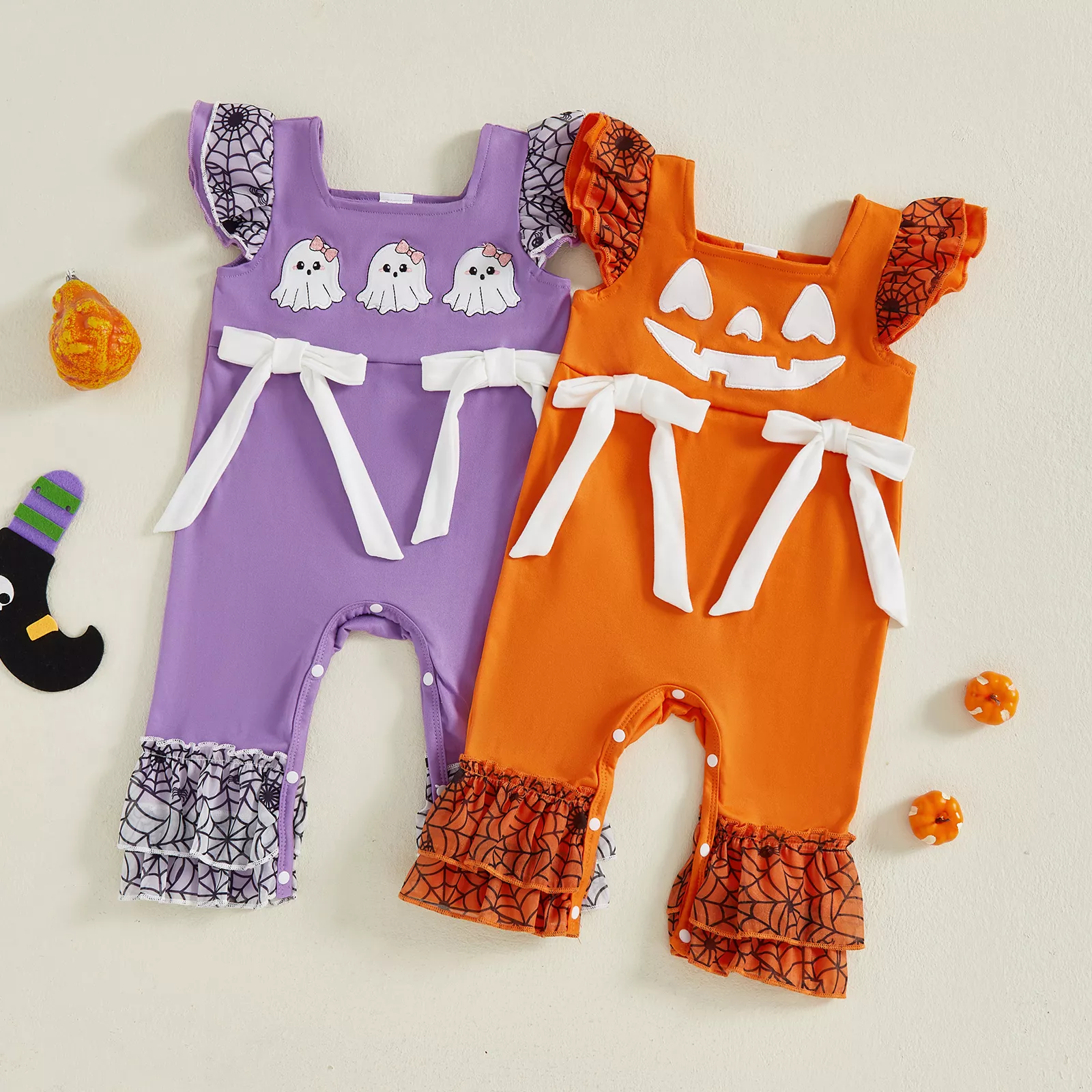 Baby Girl Halloween Ghost Romper with Fly Sleeves and Embroidery