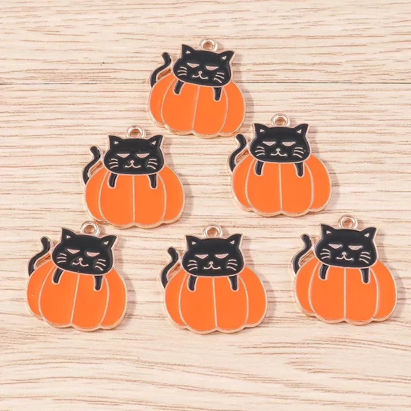 10pcs Halloween Cat & Pumpkin Charms – Enamel Pendants for DIY Jewelry Crafts