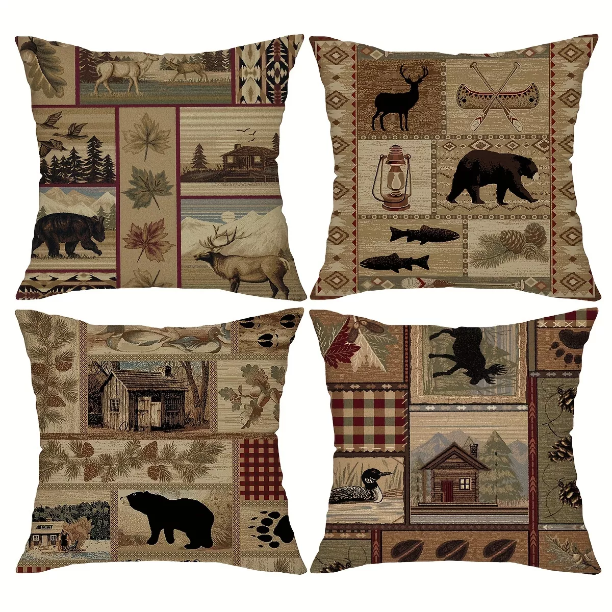 Rustic Bear & Elk Linen Blend Throw Pillow Cover 18×18 with Zip Closure