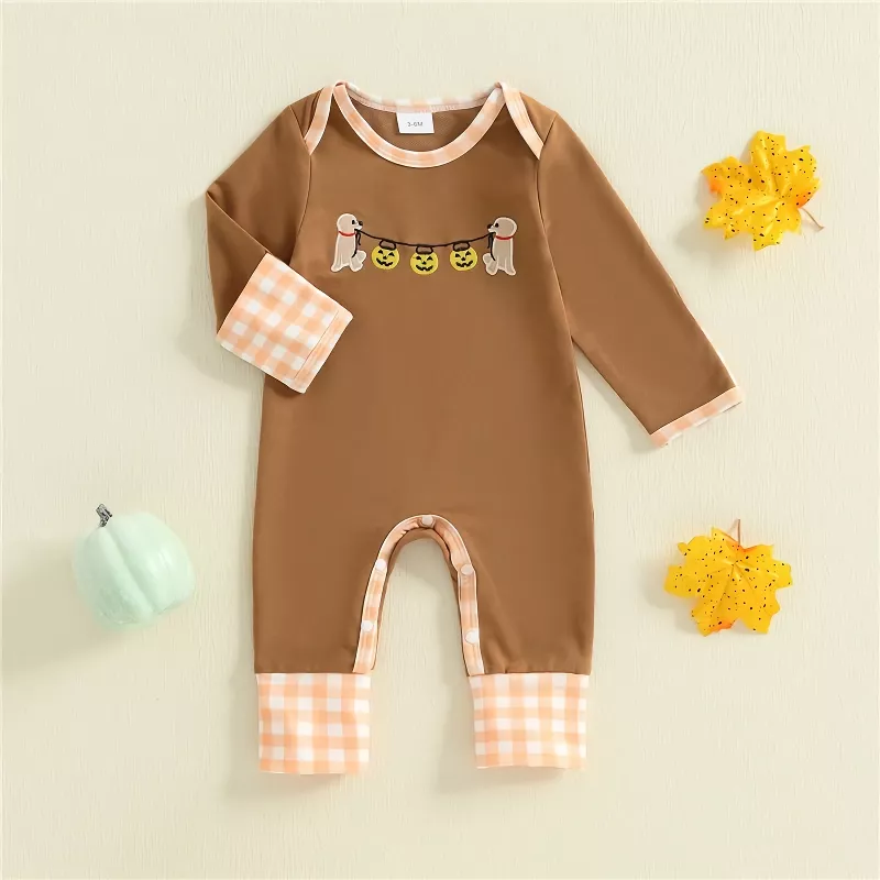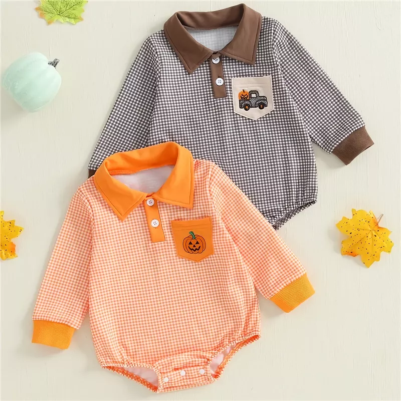 Infant Baby Boys Pumpkin Embroidery Plaid Halloween Romper Jumpsuit