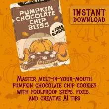 Warm spices, rich chocolate chips, and cozy autumn vibes—this is what baking dreams are made of. Pumpkin Chocolate Chip Bliss is your all-in-one digital guide to creating the most irresistible pumpkin chocolate chip cookies. Whether you’re a seasoned baker or just starting your cookie journey, this downloadable guide takes you from ingredient prep to flawless baking results, all with clear steps and pro tips. Plus, you’ll get fun AI prompts to spark endless creative cookie ideas, captions, and flavor twists. Turn your kitchen into a bakery of autumn bliss with this easy, helpful, and inspiring resource.