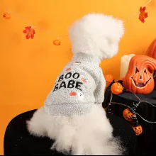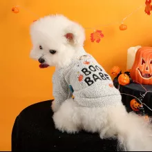 Get your pet ready for the spooky season with this adorable Pumpkin Ghost Halloween Crew Neck Pullover. Designed for both dogs and cats, this light grey jacket features playful English embroidery that captures the fun spirit of Halloween. Whether for trick-or-treating, holiday parties, or simply cozying up at home, this stylish pet outfit guarantees your furry companion will be the star of the night.