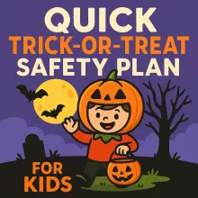 Parents, guardians, babysitters, and caregivers who want to keep kids safe and happy on Halloween night. This quick trick-or-treat safety plan for kids stands out from other guides because it’s fast to use, visually simple, and focused only on what matters most—your child’s safety and fun.