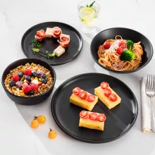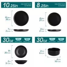 - Dinnerware set for 6: Includes 6 dinner plates (10.25″), 6 salad plates (8.25″), 6 soup plates (30 oz), and 6 bowls (30 oz).