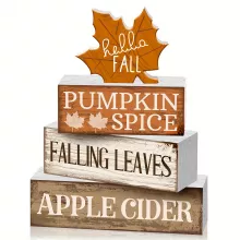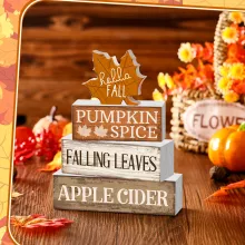 - Set includes 4 pieces: maple leaf cutouts and fall-themed block signs