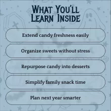 Don’t let your Halloween candy stash go to waste. Download your copy of Smart Hacks for Storing Halloween Leftover Candy today and discover fun, creative, and practical ways to manage your treats all year long!