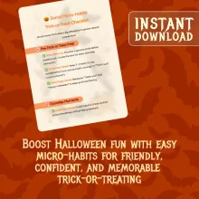 Turn Halloween night into more than just candy collecting—it can be a confidence-boosting, connection-building experience! The Social Micro-Habits Trick-or-Treat Checklist is a digital download designed to help kids, families, and even party hosts practice small but powerful social habits during trick-or-treat season. Packed with friendly reminders, easy-to-follow prompts, and fun tips, this checklist helps make every doorstep moment shine while encouraging gratitude, confidence, and neighborhood connection. Whether you’re guiding a shy child, teaching manners, or just want to make spooky-season interactions extra meaningful, this resource makes it simple and fun.