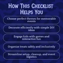 • Candy & Treat Planning: Allergy-free options, small toys, themed display ideas, and backup treats for smooth flow.