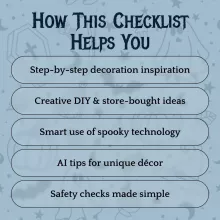 This digital checklist is perfect for homeowners, party planners, parents, and Halloween enthusiasts who want their yard to stand out. Unlike other guides, it combines traditional decorating with modern twists—like AI-generated ideas and interactive elements—to help you create a Halloween experience that’s as unique as you are.