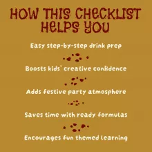 Whether you’re hosting a classroom bash, planning a Halloween night-in, or just want to make October extra magical, this checklist makes it easy to serve up unforgettable halloween drinks for kids. Skip the stress and focus on the fun—every spooky sip is already planned out for you.