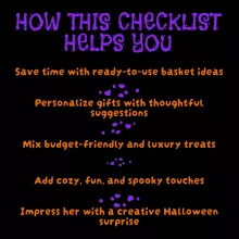 Skip the stress and enjoy the fun of creating a magical Halloween gift. Download the Spooky Basket Checklist for Her now and start building a basket she’ll absolutely love. Treat her to a spooky, sweet, and heartfelt surprise this season!