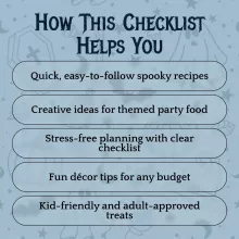 Skip the stress and focus on the fun. With the Spooky Halloween Food Checklist, you’ll impress guests with frightful flavors and creepy-cute dishes while staying effortlessly organized. Download your copy today and start planning a Halloween spread that’s as spooky as it is delicious. Don’t wait—your perfect Halloween feast is just a click away!