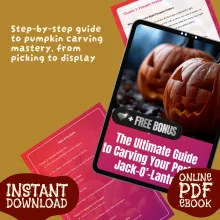 Turn your Halloween into a masterpiece with The Ultimate Guide to Carving Your Perfect Jack-O’-Lantern—a digital ebook that walks you through every step of the process. Whether you’re brand new to pumpkin carving or looking to refine your skills, this guide blends tradition with modern tips (including AI design inspiration) to make your carving experience fun, safe, and creative. If you’ve ever wondered how to carve the pumpkin with precision, this ebook has the answers.