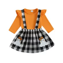 Make your little one the star of Halloween with this charming 2-piece toddler girl outfit. The set includes a solid-color long sleeve top and a ghost-pattern plaid suspender skirt that perfectly blends cuteness with festive spirit. Soft, breathable, and comfortable, this outfit is designed for all-day wear, whether trick-or-treating, attending a Halloween party, or posing for family photos.