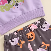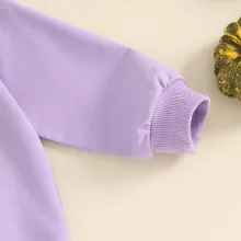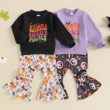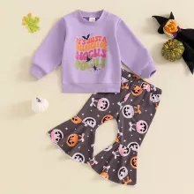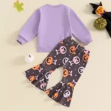 The pumpkin print flare pants add a burst of Halloween fun, while the letter print sweatshirt adds a stylish touch that’s both trendy and cozy. Together, they make for a unique and eye-catching set that will make your baby girl shine at every event.