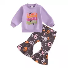 The pumpkin print flare pants add a burst of Halloween fun, while the letter print sweatshirt adds a stylish touch that’s both trendy and cozy. Together, they make for a unique and eye-catching set that will make your baby girl shine at every event.