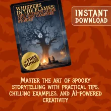 This isn’t just another collection of stories—it’s a masterclass in how to create them. Unlike typical resources that simply list tales, Whispers in the Flames teaches you how to craft your own spine-tingling narratives. With a mix of timeless storytelling techniques and AI-powered creativity, it’s designed for anyone who wants to captivate an audience around the fire, in the dark, or even at a Halloween party.